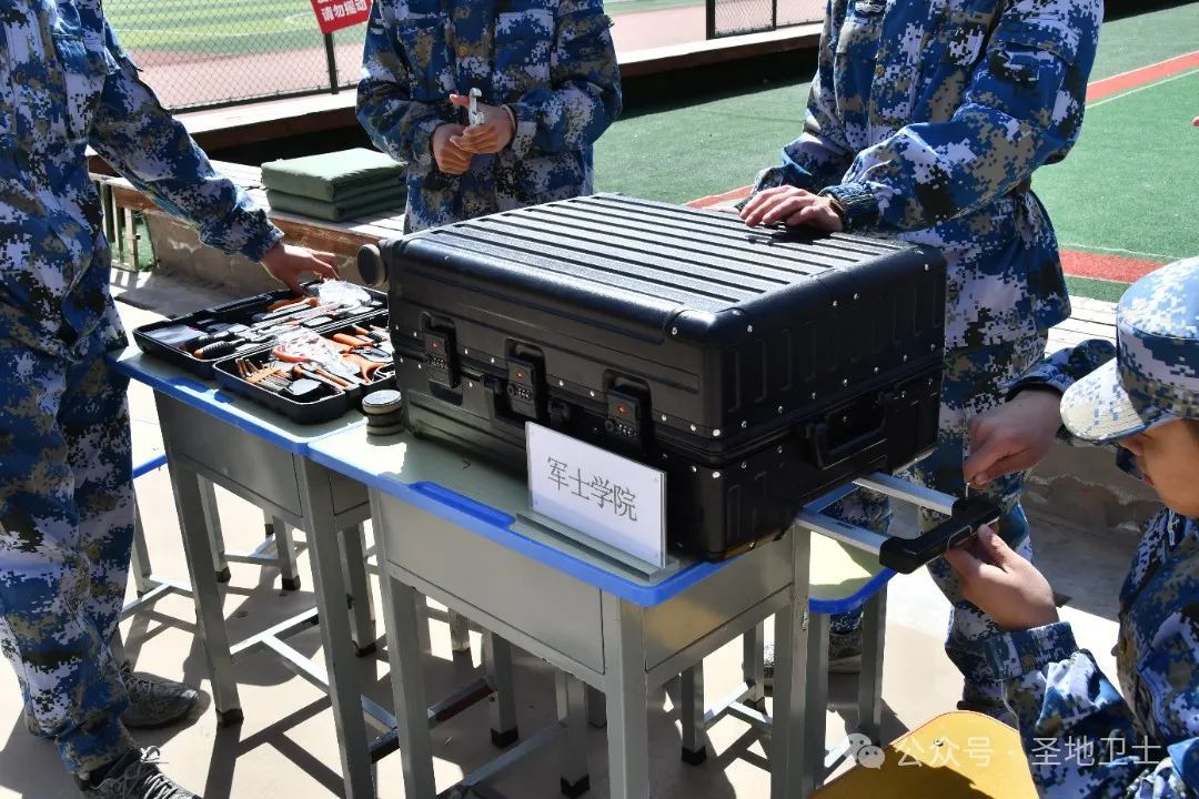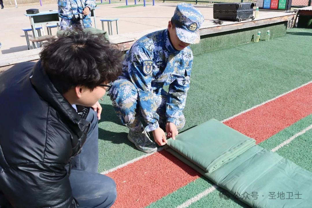 军士生们利用学校运动场地,现场展示并教授叠“豆腐块”,他们亲自讲解并教授叠豆腐块的重难点,正所谓“三分叠被修心性,七寸方隅炼毅坚。”之后,邀请普通系学生实操叠豆腐块,感受军士生的精干作风。