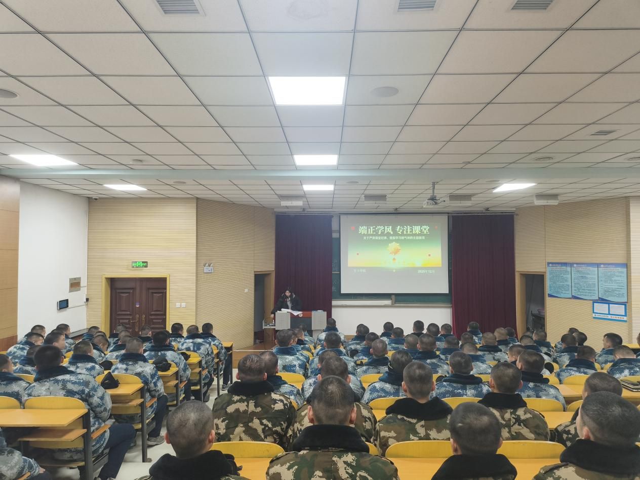 为严肃课堂纪律、提振学习状态,军士学院五连连长朱军旭与辅导员王雅对2024级空军、武警学员召开“端正学风 砺剑课堂”主题教育班会。